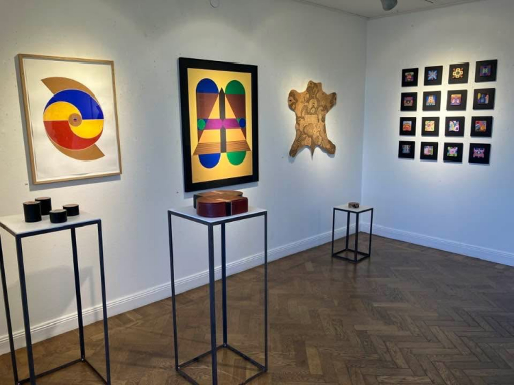 Marje Taskas leather art shows a geometric minimalist symbolism and expresses Taska’s interest in and her associations with the intellectual and spiritual world.